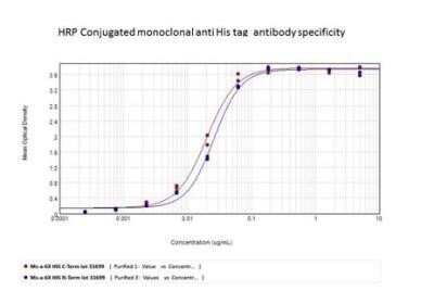 ELISA: His Tag Antibody (33D10.D2.G8) [HRP] [NBP1-42783] - Antigen: 6X HIS-tagged conjugated BSA at the N or C terminus of the 6XHis. Coating amount: 0.15 ug per well. Primary antibody (direct detection): HRP conjugated 6xHIS Tag antibody diluted from stock concentration at 100 ug/mL. Substrate: TMB ELISA peroxidase substrate.