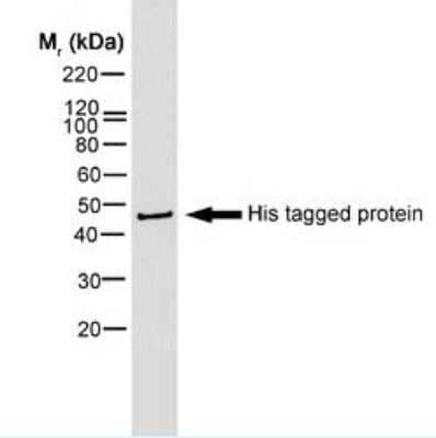 Western Blot: 6-Histidine Epitope Tag Antibody (AD1.1.10) [HRP] [NB100-63173] - HIS-tagged protein probed with Mouse anti Histidine tag visualised with Rabbit anti Mouse IgG : HRP.
