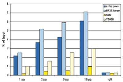 Chromatin Immunoprecipitation: H2AZ Antibody [NBP2-54618] - ChIP assays were performed using human HeLa cells, the antibody against H2A.Z and optimized PCR primer pairs for qPCR. ChIP was performed using sheared chromatin from 1,000,000 cells. A titration consisting of 1, 2, 5 and 10 ug of antibody per ChIP experiment was analyzed. IgG (2 ug/IP) was used as a negative IP control. Quantitative PCR was performed with primers specific for the promoter of the active genes c-fos and EIF2S3, used as positive controls, and for the inactive TSH2B gene and the Sat2 satellite repeat, used as negative controls.