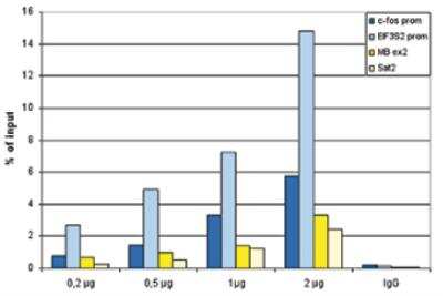 Chromatin Immunoprecipitation: H2AZ Antibody [NBP2-54618] - ChIP assays were performed using human K562 cells, the antibody against H2A.Z and optimized PCR primer sets for qPCR. ChIP was performed with sheared chromatin from 100,000 cells. A titration of the antibody consisting of 0.2, 0.5, 1 and 2ug per ChIP experiment was analysed. IgG (1 ug/IP) was used as negative IP control. Quantitative PCR was performed with primers specific for the promoter of the active genes c-fos and EIF2S3, used as positive controls, and for the coding region of the inactive MB gene and the Sat2 satellite repeat, used as negative controls. Figure shows the recovery, expressed as a % of input (the relative amount of immunoprecipitated DNA compared to input DNA after qPCR analysis).