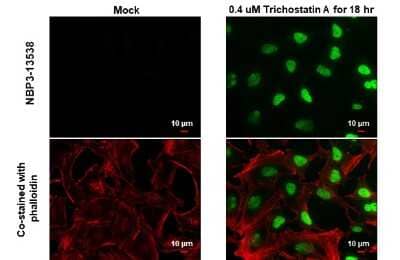 Immunocytochemistry/Immunofluorescence: Histone H2B [ac Lys20] Antibody (GT578) [NBP3-13538] - Histone H2B (acetyl Lys20) antibody [GT578] detects Histone H2B (acetyl Lys20) protein at nucleus by immunofluorescent analysis. Sample: Mock and treated HeLa cells were fixed in 4% paraformaldehyde at RT for 15 min. Green: Histone H2B (acetyl Lys20) stained by Histone H2B (acetyl Lys20) antibody [GT578] (NBP3-13538) diluted at 1:500. Red: phalloidin, a cytoskeleton marker, diluted at 1:100. Scale bar= 10 um.