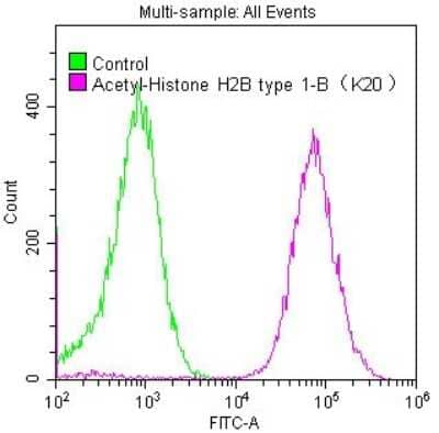 Flow Cytometry: Histone H2B type 1B [ac Lys20] Antibody (21F11) [NBP3-15229] - Overlay histogram showing Hela cells stained with Histone H2B type 1B antibody (red line) at 1:50. The cells were fixed with 70% Ethylalcohol (18h) and then permeabilized with 0.3% Triton X-100 for 2 min.The cells were then incubated in 1x PBS /10% normal goat serum to block non-specific protein-protein interactions followed by primary antibody for 1 h at 4C.The secondary antibody used was FITC goat anti-rabbit IgG (H+L) at 1/200 dilution for 1 h at 4C. Control antibody (green line) was used under the same conditions. Acquisition of >10,000 events was performed.
