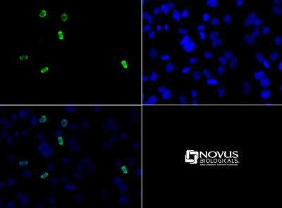 Immunocytochemistry/Immunofluorescence: Histone H3 [Asym-dimethyl Arg2] Antibody [NB21-1002] - Histone H3 [Asym-dimethyl Arg2] antibody was tested in HeLa cells with DyLight 488 (green). Nuclei were counterstained with DAPI (blue).