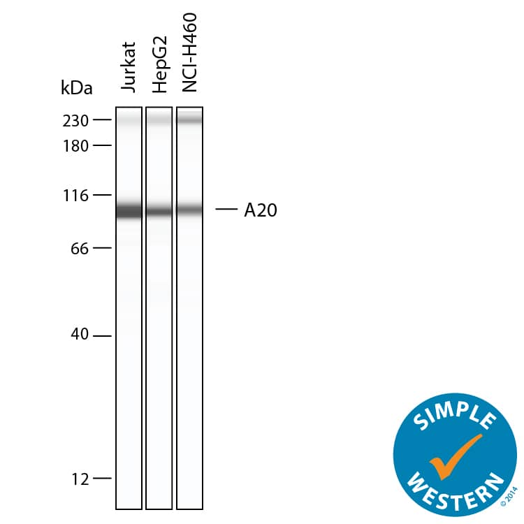 Simple Western lane view shows lysates of Jurkat human acute T cell leukemia cells, HepG2 human hepatocellular carcinoma cells, and NCI-H460 human large cell lung carcinoma cells, loaded at 0.2 mg/mL. A specific band was detected for A20/TNFAIP3 at approximately 101 kDa (as indicated) using 20 µg/mL of Mouse Anti-Human A20/TNFAIP3 Monoclonal Antibody (Catalog # MAB7598). This experiment was conducted under reducing conditions and using the 12-230 kDa separation system.Applications for Human A20/TNFAIP3 Antibody