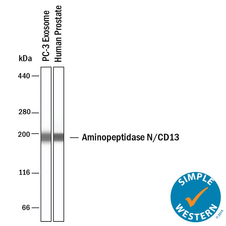 Western blot shows lysates of human prostate tissue, human liver tissue, HepG2 human hepatocellular carcinoma cell line, and PC-3 human prostate cancer cell line. PVDF membrane was probed with 1 µg/mL of Mouse Anti-Human Aminopeptidase N/CD13 Monoclonal Antibody (Catalog # MAB38151) followed by HRP-conjugated Anti-Mouse IgG Secondary Antibody (Catalog # HAF018). A specific band was detected for Aminopeptidase N/CD13 at approximately 150 kDa (as indicated). This experiment was conducted under reducing conditions and using Immunoblot Buffer Group 1.Detection of Human Aminopeptidase N/CD13 by Simple WesternTM.