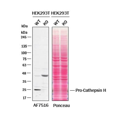 Western blot shows lysates of HEK293T human embryonic kidney cell line and Cathepsin H knockout HEK293T cell line (KO). Nitrocellulose membrane was probed with 0.2 µg/mL of Sheep Anti-Human Cathepsin H Antigen Affinity-purified Polyclonal Antibody (Catalog # AF7516) followed by HRP-conjugated Anti-Sheep IgG Secondary Antibody. A specific band was detected for Cathepsin H at approximately 25 kDa (as indicated) in the parental HEK293T cell line, but is not detectable in knockout HEK293T cell line. The Ponceau stained transfer of the blot is shown. This experiment was conducted under reducing conditions. Image, protocol, and testing courtesy of YCharOS Inc. See ycharos.com for additional details.Applications for Human Cathepsin H Antibody