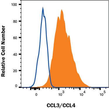 U266 cells were stained with Mouse Anti-Human CCL3/CCL4 Monoclonal Antibody (Catalog # MAB2701, filled histogram) or isotype control antibody (Catalog # MAB004, open histogram) followed by Allophycocyanin-conjugated Anti-Mouse IgG Secondary Antibody (Catalog # F0101B). To facilitate intracellular staining, cells were fixed with Flow Cytometry Fixation Buffer (Catalog # FC004) and permeabilized with Flow Cytometry Permeabilization/Wash Buffer I (Catalog # FC005). View our protocol for Staining Intracellular Molecules.Applications for Human CCL3/CCL4 Antibody