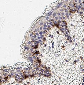 CD1a was detected in immersion fixed paraffin-embedded sections of Human Skin using Mouse Anti-Human CD1a Monoclonal Antibody (Catalog # MAB7076) at 3 µg/mL for 1 hour at room temperature followed by incubation with the Anti-Mouse IgG VisUCyte™ HRP Polymer Antibody (Catalog # VC001). Before incubation with the primary antibody, tissue was subjected to heat-induced epitope retrieval using VisUCyte Antigen Retrieval Reagent-Basic (Catalog # VCTS021). Tissue was stained using DAB (brown) and counterstained with hematoxylin (blue). Specific staining was localized to Langerhan's cells. View our protocol for IHC Staining with VisUCyte HRP Polymer Detection Reagents.Applications for Human CD1a Antibody