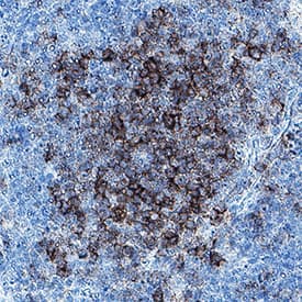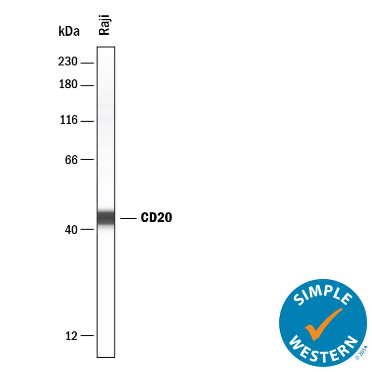 CD20 was detected in immersion fixed paraffin-embedded sections of human tonsil using Rabbit Anti-Human CD20 Monoclonal Antibody (MAB42252) at 3ug/mL dilution at 37 ° Celsius for 4 minutes. Before incubation with the primary antibody, tissue underwent an all-in-one dewaxing and antigen retrieval preprocessing using PreTreatment Module (PT Module) and Dewax and HIER Buffer H (pH 9). Tissue was stained using the Alexa Fluor™ Plus 647 Goat anti-Rabbit IgG Secondary Antibody at 1:200 at 37 ° Celsius for 2 minutes. (Yellow; Lunaphore Catalog # DR647RB) and counterstained with DAPI (blue; Lunaphore Catalog # DR100). Specific staining was localized to the membrane of B-cells. Protocol available in COMET™ Panel Builder.Detection of Human CD20 by Western Blot.