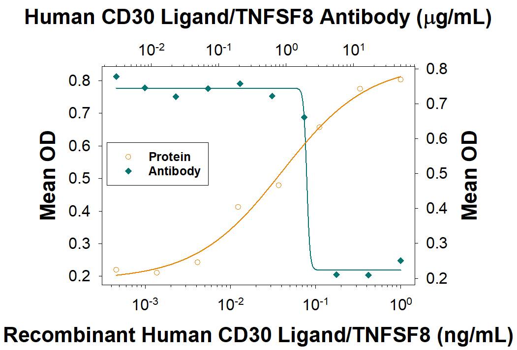 Detects human CD30 LIgand/TNFSF8 in direct ELISAs.