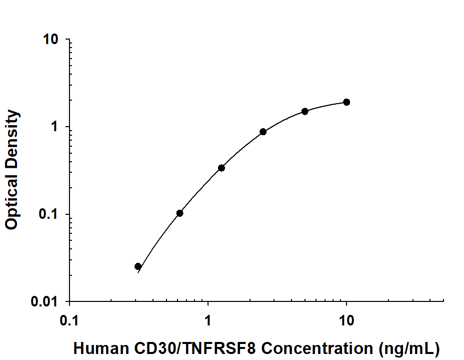 Recombinant Human CD30/TNFRSF8 protein was serially diluted 2-fold and captured by Mouse Anti-Human CD30/TNFRSF8 Monoclonal Antibody (MAB2291) coated on a Clear Polystyrene Microplate (DY990). Goat Anti-Human CD30/TNFRSF8 Antigen Affinity-purified Polyclonal Antibody (Catalog # AF229) was biotinylated and incubated with the protein captured on the plate. Detection of the standard curve was achieved by incubating Streptavidin-HRP (DY998) followed by Substrate Solution (DY999) and stopping the enzymatic reaction with Stop Solution (DY994).Applications for Human CD30/TNFRSF8 Antibody