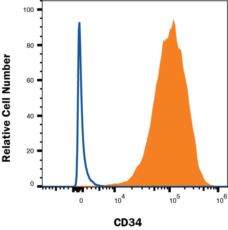 Human peripheral blood mononuclear cells (PBMCs) were stained with Mouse Anti-Human CD45 PE-conjugated Monoclonal Antibody (Catalog # FAB1430P) and either (A) Mouse Anti-Human CD34 Alexa Fluor® 700-conjugated Monoclonal Antibody (Catalog # FAB7227N) or (B) Mouse IgG1 Alexa Fluor 700 Isotype Control (Catalog # IC002N). View our protocol for Staining Membrane-associated Proteins.Detection of CD34 in KG‑1a Human Cell Line by Flow Cytometry.