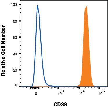 Daudi cells were stained with Mouse Anti-Human CD38 PerCP-conjugated Monoclonal Antibody (Catalog # FAB2404C, filled histogram) or isotype control antibody (Catalog # IC003C, open histogram). View our protocol for Staining Membrane-associated Proteins.Applications for Human CD38 PerCP-conjugated Antibody