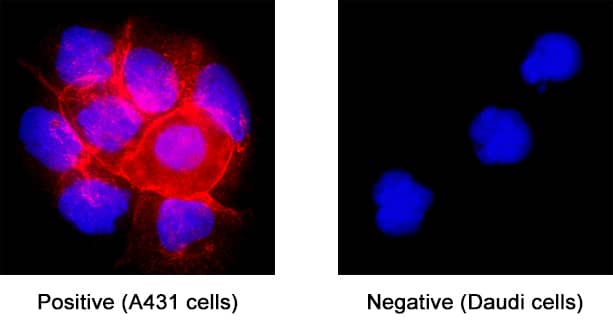CD44 was detected in immersion fixed A431 human epithelial carcinoma cell line (positive staining) and Daudi human Burkitt's lymphoma cell line (negative staining) using Mouse Anti-Human CD44 v6 Monoclonal Antibody (Catalog # BBA13) at 25 µg/mL for 3 hours at room temperature. Cells were stained using the NorthernLights™ 557-conjugated Anti-Mouse IgG Secondary Antibody (red; NL007) and counterstained with DAPI (blue). Specific staining was localized to cell surface. Staining was performed using our protocol for Fluorescent ICC Staining of Non-adherent Cells.CD44 in Human Colon Adenocarcinoma Tissue.