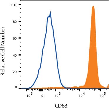 Human PBMC were stained with Rabbit Anti-Human CD63 Monoclonal Antibody (Catalog # MAB50482, filled histogram) or isotype control antibody (Catalog # MAB1050, open histogram), followed by Phycoerythrin-conjugated Anti-Rabbit IgG Secondary Antibody (F0111). To facilitate intracellular staining, cells were fixed and permeabilized with FlowX FoxP3/Transcription Factor Fixation & Perm Buffer Kit (FC012). View our protocol for Staining Intracellular Molecules.Applications for Human CD63 Antibody