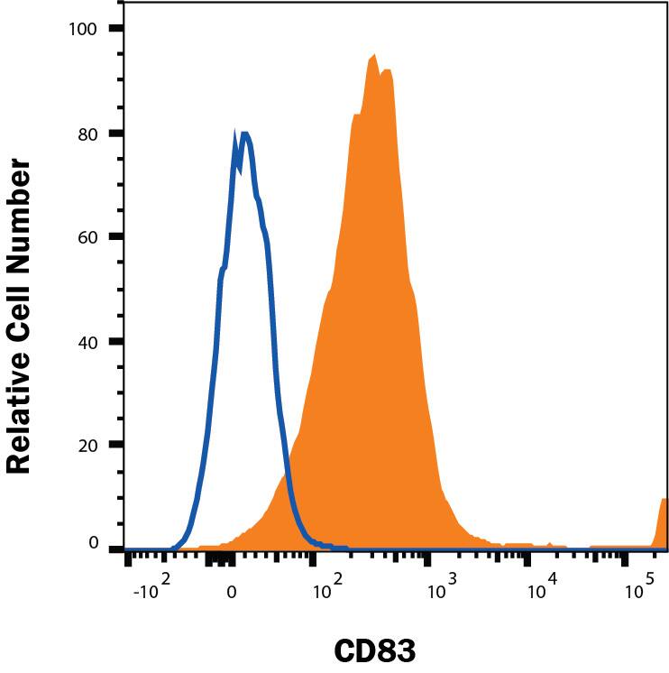 Daudi cells were stained with Mouse Anti-Human CD83 PE-conjugated Monoclonal Antibody (Catalog # FAB1774P, filled histogram) or isotype control antibody (Catalog # IC002P, open histogram). View our protocol for Staining Membrane-associated Proteins.Applications for Human CD83 PE-conjugated Antibody