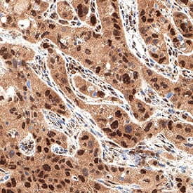 Cdk6 was detected in immersion fixed paraffin-embedded sections of human lung cancer using Mouse Anti-Human Cdk6 Monoclonal Antibody (Catalog # MAB11636) at 5 µg/ml for 1 hour at room temperature followed by incubation with the Anti-Mouse IgG VisUCyte™ HRP Polymer Antibody (Catalog # VC001). Before incubation with the primary antibody, tissue was subjected to heat-induced epitope retrieval using VisUCyte Antigen Retrieval Reagent-Basic (Catalog # VCTS021). Tissue was stained using DAB (brown) and counterstained with hematoxylin (blue). Specific staining was localized to the nucleus and cytoplasm. View our protocol for IHC Staining with VisUCyte HRP Polymer Detection Reagents.Detection of Cdk6 in Human Pancreatic Cancer.