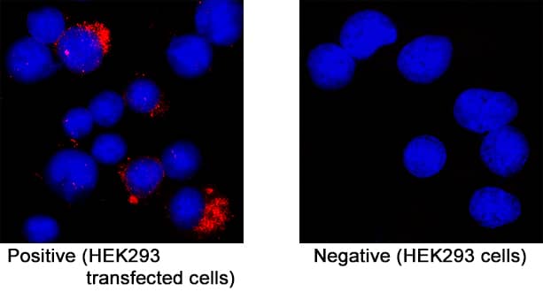 CEACAM-16 was detected in immersion fixed HEK293 human embryonic kidney cell line transfected (positive staining) and HEK293 human embryonic kidney cell line (non-transfected, negative staining) using Rabbit Anti-Human CEACAM-16 Monoclonal Antibody (Catalog # MAB9885) at 3 µg/mL for 3 hours at room temperature. Cells were stained using the NorthernLights™ 557-conjugated Anti-Rabbit IgG Secondary Antibody (red; NL004) and counterstained with DAPI (blue). Specific staining was localized to cytoplasm. Staining was performed using our protocol for Fluorescent ICC Staining of Non-adherent Cells.Applications for Human CEACAM-16 Antibody