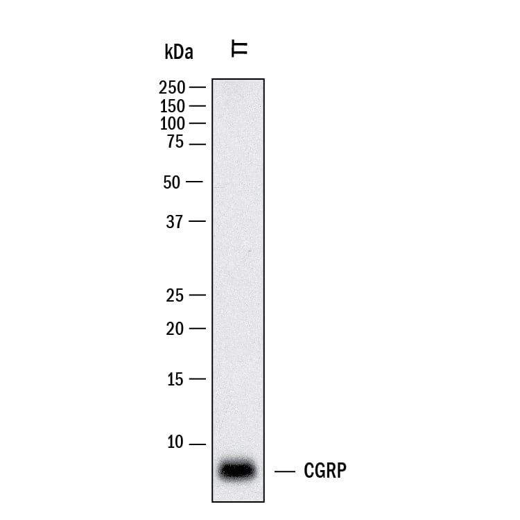 Western blot shows lysates of TT human medullary thyroid cancer cell line. PVDF membrane was probed with 0.5 µg/mL of Rabbit Anti-Human CGRP Monoclonal Antibody (Catalog # MAB83503) followed by HRP-conjugated Anti-Rabbit IgG Secondary Antibody (Catalog # HAF008). A specific band was detected for CGRP at approximately 8 kDa (as indicated). This experiment was conducted under reducing conditions and using Western Blot Buffer Group 1.Detection of Human CGRP by Simple WesternTM.