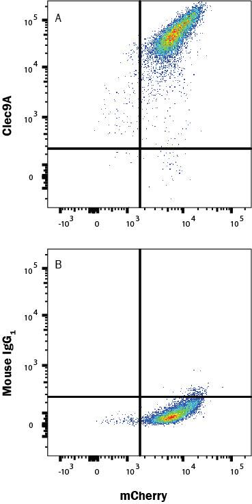Human peripheral blood cells gated on CD3-CD141+cells were stained with Mouse Anti-Human HLA-DR PerCP-conjugated Monoclonal Antibody (Catalog # FAB4869C) and either (A) Mouse Anti-Human CLEC9a Alexa Fluor® 488-conjugated Monoclonal Antibody (Catalog # FAB6049G) or (B) Mouse IgG1Alexa Fluor 488 Isotype Control (IC002G). View our protocol for Staining Membrane-associated Proteins.Detection of CLEC9a in HEK293 Human Cell Line Transfected with Human Clec9a and mCherry by Flow Cytometry.