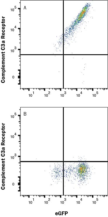 HEK293 human embryonic kidney cell line transfected with human C3aR and eGFP (A) vs irrelevant transfectant (B) were stained with Mouse Anti-Human Complement Component C3aR APC-conjugated Monoclonal Antibody (Catalog # FAB5995A). View our protocol for Staining Membrane-associated Proteins.