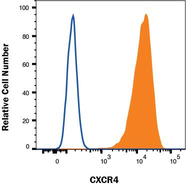 Jurkat (filled histogram) vs K562 (open histogram) cells were stained with Mouse Anti-Human CXCR4 Biotinylated Monoclonal Antibody (Catalog # FAB170B). View our protocol for Staining Membrane-associated Proteins.Applications for Human CXCR4 Biotinylated Antibody