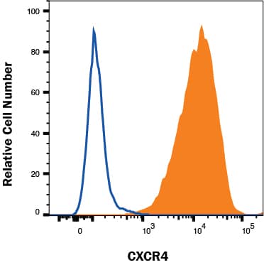 Jurkat (filled histogram) vs K562 (open histogram) cells were stained with Mouse Anti-Human CXCR4 PE-conjugated Monoclonal Antibody (Catalog # FAB170P). View our protocol for Staining Membrane-associated Proteins.Applications for Human CXCR4 PE-conjugated Antibody