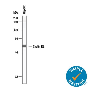 Simple Western lane view shows lysates of HepG2 human hepatocellular carcinoma cell line, loaded at 0.2 mg/mL. A specific band was detected for Cyclin E1 at approximately 53 kDa (as indicated) using 10 µg/mL of Sheep Anti-Human Cyclin E1 Antigen Affinity-purified Polyclonal Antibody (Catalog # AF6810) followed by 1:50 dilution of HRP-conjugated Anti-Sheep IgG Secondary Antibody (Catalog # HAF016). This experiment was conducted under reducing conditions and using the 12-230 kDa separation system.Applications for Human Cyclin E1 Antibody