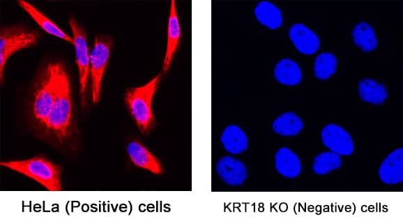 Cytokeratin 18 was detected in immersion fixed HeLa human cervical epithelial carcinoma cell line using Sheep Anti-Human Cytokeratin 18 Antigen Affinity-purified Polyclonal Antibody (Catalog # AF7619) at 5 µg/mL for 3 hours at room temperature. Cells were stained using the NorthernLights™ 557-conjugated Anti-Sheep IgG Secondary Antibody (red; NL010) and counterstained with DAPI (blue). Specific staining was localized to cytoskeletal fibers. View our protocol for Fluorescent ICC Staining of Cells on Coverslips.Applications for Human Cytokeratin 18 Antibody