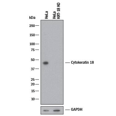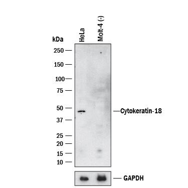 Western blot shows lysates of HeLa human cervical epithelial carcinoma cell line (Cytokeratin 18 positive) and MOLT-4 human acute lymphoblastic leukemia cell line (Cytokeratin 18 negative). PVDF membrane was probed with 1 µg/mL of Sheep Anti-Human Cytokeratin 18 Antigen Affinity-purified Polyclonal Antibody (Catalog # AF7619) followed by HRP-conjugated Anti-Sheep IgG Secondary Antibody (HAF016). A specific band was detected for Cytokeratin 18 at approximately 45 kDa (as indicated). GAPDH (AF5718) is shown as a loading control. This experiment was conducted under reducing conditions and using Western Blot Buffer Group 1.Cytokeratin 18 in HeLa Human Cell Line.