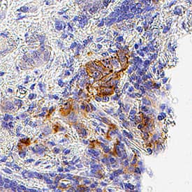 DPPIV/CD26 was detected in immersion fixed paraffin-embedded sections of human prostate cancer using Mouse Anti-Human DPPIV/CD26 Monoclonal Antibody (Catalog # MAB11664) at 5 µg/ml for 1 hour at room temperature followed by incubation with the Anti-Mouse IgG VisUCyte™ HRP Polymer Antibody (Catalog # VC001) or the HRP-conjugated Anti-Mouse IgG Secondary Antibody (Catalog # HAF007). Before incubation with the primary antibody, tissue was subjected to heat-induced epitope retrieval using VisUCyte Antigen Retrieval Reagent-Basic (Catalog # VCTS021). Tissue was stained using DAB (brown) and counterstained with hematoxylin (blue). Specific staining was localized to the membrane of lymphatic vessels. View our protocol for IHC Staining with VisUCyte HRP Polymer Detection Reagents.Applications for Human DPPIV/CD26 Antibody