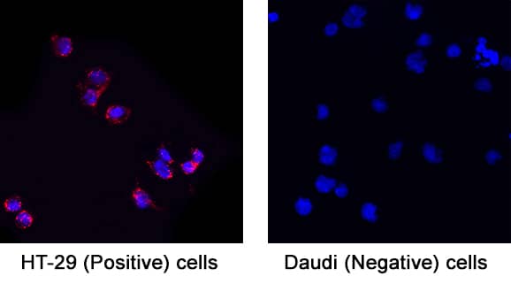 Sample: Immersion fixed HT‑29 human colon adenocarcinoma cell line (positive) and Daudi human Burkitt's lymphoma cell line (negative) cells