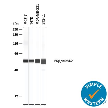 Detects human ER beta/NR3A2 in direct ELISAs and Western blot. In direct ELISA and Western blot, no cross-reactivity with recombinant human ER alpha is observed.