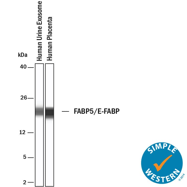 Simple Western lane view shows lysates of Exosome Standards (Human Urine) (NBP2-49840) and human placenta tissue, loaded at 0.5 mg/ml. A specific band was detected for FABP5/E-FABP at approximately 20 kDa (as indicated) using 10 µg/ml of Goat Anti-Human FABP5/E-FABP Antigen Affinity-purified Polyclonal Antibody (Catalog # AF3077) followed by HRP-conjugated Donkey Anti-Goat Secondary Antibody (Catalog # 042-206). This experiment was conducted under reducing conditions and using the 2-40kDa separation system.FABP5/E‑FABP in HUVEC Human Umbilical Vein Endothelial Cells.