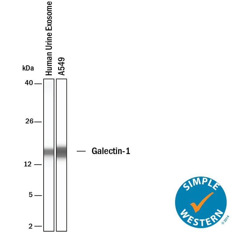 Western blot shows lysates of HeLa human cervical epithelial carcinoma cell line and A549 human lung carcinoma cell line. PVDF membrane was probed with 0.1 µg/mL of Goat Anti-Human Galectin-1 Antigen Affinity-purified Polyclonal Antibody (Catalog # AF1152) followed by HRP-conjugated Anti-Goat IgG Secondary Antibody (HAF109). A specific band was detected for Galectin-1 at approximately 14 kDa (as indicated). This experiment was conducted under reducing conditions and using Immunoblot Buffer Group 1.Detection of Human Galectin-1 by Simple WesternTM.