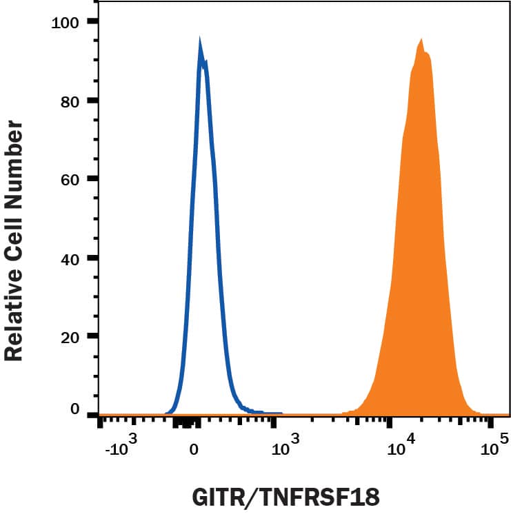 RPMI8226 (positive cell line)/Jurkat (negative cell line) were stained with Mouse Anti-Human GITR/TNFRSF18 APC-conjugated Monoclonal Antibody (Catalog # FAB689A, filled histogram) or , open histogram). View our protocol for Staining Membrane-associated Proteins.Applications for Human GITR/TNFRSF18 APC-conjugated Antibody