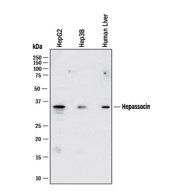 Western blot shows lysates of HepG2 human hepatocellular carcinoma cell line, Hep3B human hepatocellular carcinoma cell line, Human Liver. PVDF membrane was probed with 2 µg/mL of Mouse Anti-Human Hepassocin/FGL1 Monoclonal Antibody (Catalog # MAB16143) followed by HRP-conjugated Anti-Mouse IgG Secondary Antibody (Catalog # HAF018). A specific band was detected for Hepassocin/FGL1 at approximately 34 kDa (as indicated). This experiment was conducted under reducing conditions and using Western Blot Buffer Group 1.Applications for Human Hepassocin/FGL1 Antibody