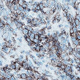 ICAM-3/CD50 was detected in immersion fixed paraffin-embedded sections of human lymph node using Mouse Anti-Human ICAM-3/CD50 Monoclonal Antibody (Catalog # MAB8131) at 5 µg/mL for 1 hour at room temperature followed by incubation with the Anti-Mouse IgG VisUCyte™ HRP Polymer Antibody (VC001). Before incubation with the primary antibody, tissue was subjected to heat-induced epitope retrieval using Antigen Retrieval Reagent-Basic (CTS013). Tissue was stained using DAB (brown) and counterstained with hematoxylin (blue). Specific staining was localized to cell surface of lymphocytes. Staining was performed using our protocol for IHC Staining with VisUCyte HRP Polymer Detection Reagents.