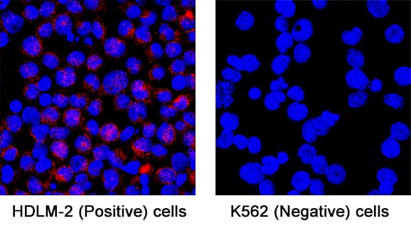 Sample: Immersion fixed HDLM-2 human Hodgkin's lymphoma cells (positive) and absent in K562 human chronic myelogenous leukemia cells (negative)