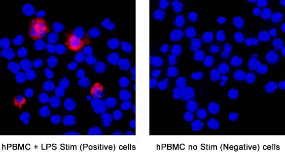 Sample: Immersion fixed Human PBMCs stimulated with LPS (positive control) and untreated human PBMCs (negative control)