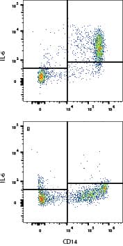 Human peripheral blood mononuclear cells (PBMCs) treated with 100 ng/mL LPS for 24 hours were stained with Mouse Anti-Human IL-6 Monoclonal Antibody (Catalog # MAB2061, filled histogram) or isotype control antibody (MAB004, open histogram), followed by Phycoerythrin-conjugated Anti-Mouse IgG Secondary Antibody (F0102B). To facilitate intracellular staining, cells were fixed with Flow Cytometry Fixation Buffer (FC004) and permeabilized with Flow Cytometry Permeabilization/Wash Buffer I (FC005). View our protocol for Staining Intracellular Molecules.Cell Proliferation Induced by IL‑6 and Neutralization by Human IL‑6 Antibody.