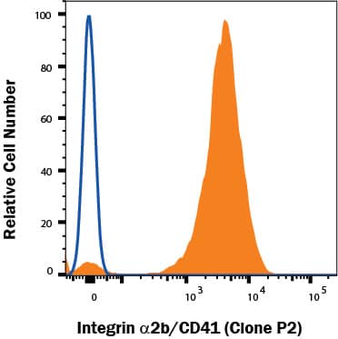 Western blot shows lysates of human platelets. PVDF membrane was probed with 2 µg/mL of Mouse Anti-Human Integrin a2b/CD41 Monoclonal Antibody (Catalog # MAB7616) followed by HRP-conjugated Anti-Mouse IgG Secondary Antibody (HAF007). A specific band was detected for Integrin a2b/CD41 at approximately 130 kDa (as indicated). This experiment was conducted under reducing conditions and using Immunoblot Buffer Group 5.Detection of Integrin alpha2b/CD41 in Human Blood Platelets by Flow Cytometry.