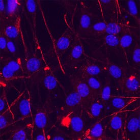 Integrin beta1/CD29 was detected in immersion fixed A549 human lung carcinoma cell line using Mouse Anti-Human Integrin beta1/CD29 Monoclonal Antibody (Catalog # MAB1778) at 8 µg/mL for 3 hours at room temperature. Cells were stained using the NorthernLights™ 557-conjugated Anti-Mouse IgG Secondary Antibody (red; NL007) and counterstained with DAPI (blue). Specific staining was localized to plasma membrane.