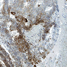 ISG15/UCRP was detected in immersion fixed paraffin-embedded sections of Human Endometrial Cancer using Mouse Anti-Human ISG15/UCRP Monoclonal Antibody (Catalog # MAB4845) at 0.5 µg/mL for 1 hour at room temperature followed by incubation with the Anti-Mouse IgG VisUCyte™ HRP Polymer Antibody (Catalog # VC001). Before incubation with the primary antibody, tissue was subjected to heat-induced epitope retrieval using VisUCyte Antigen Retrieval Reagent-Basic (Catalog # VCTS021). Tissue was stained using DAB (brown) and counterstained with hematoxylin (blue). Specific staining was localized to cytoplasm in cancer cells. View our protocol for IHC Staining with VisUCyte HRP Polymer Detection Reagents.