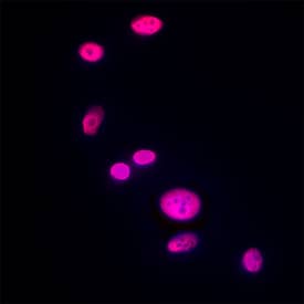 KAP1 was detected in immersion fixed Neuro-2A mouse neuroblastoma cell line using Mouse Anti-Human KAP1 Monoclonal Antibody (Catalog # MAB7785) at 8 µg/mL for 3 hours at room temperature. Cells were stained using the NorthernLights™ 557-conjugated Anti-Mouse IgG Secondary Antibody (red; NL007) and counterstained with DAPI (blue). Specific staining was localized to nuclei. View our protocol for Fluorescent ICC Staining of Cells on Coverslips.Applications for Human KAP1 Antibody