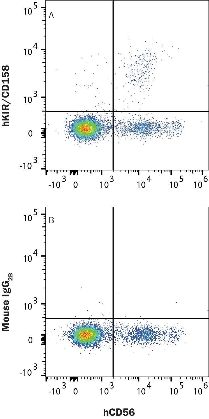 PBMC lymphocytes were stained with Rabbit Anti-Human NCAM‑1/CD56 PE‑conjugated Monoclonal Antibody (FAB24086P) and either (A) Mouse Anti-Human KIR/CD158 Alexa Fluor® 647‑conjugated Monoclonal Antibody (Catalog # FAB1848R) or (B) isotype control antibody (IC0041R). View our protocol for Staining Membrane-associated Proteins.Applications for Human KIR/CD158 Alexa Fluor® 647-conjugated Antibody