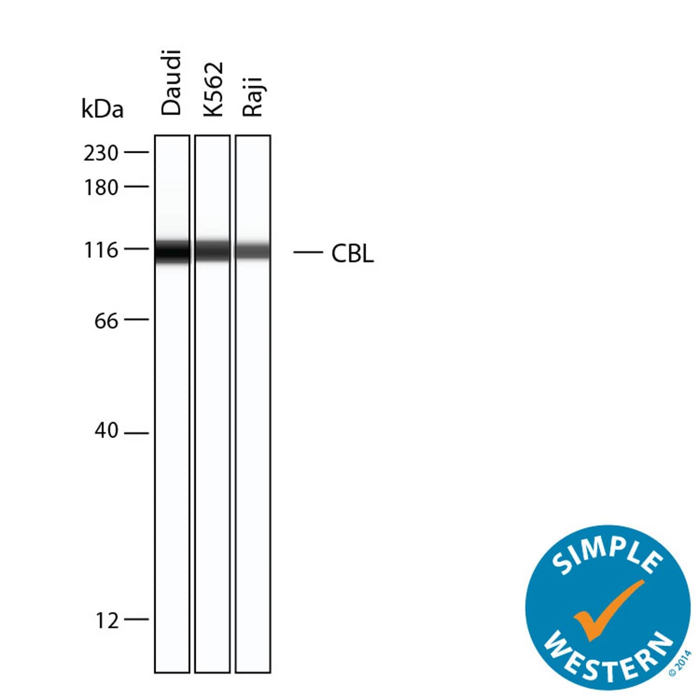 Simple Western lane view shows lysates of Daudi human Burkitt's lymphoma cells, K562 human chronic myelogenous leukemia cells, Raji human Burkitt's lymphoma cells, loaded at 0.2 mg/mL. A specific band was detected for CBL at approximately 116 kDa (as indicated) using 10 µg/mL of Mouse Anti-Human/Mouse CBL Monoclonal Antibody (Catalog # MAB5998). This experiment was conducted under reducing conditions and using the 12-230 kDa separation system.Applications for Human/Mouse CBL Antibody