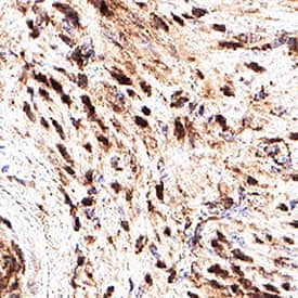 EMX2 was detected in immersion fixed paraffin-embedded sections of uterus using Sheep Anti-Human/Mouse EMX2 Antigen Affinity-purified Polyclonal Antibody (Catalog # AF6470) at 1 µg/ml overnight at 4 °C. Before incubation with the primary antibody, tissue was subjected to heat-induced epitope retrieval using VisUCyte Antigen Retrieval Reagent-Basic (Catalog # VCTS021). Tissue was stained using the Anti-Sheep HRP-DAB Cell & Tissue Staining Kit (brown; Catalog # CTS019) and counterstained with hematoxylin (blue). Specific staining was localized to nucleus. View our protocol for Chromogenic IHC Staining of Paraffin-embedded Tissue Sections.Applications for Human/Mouse EMX2 Antibody