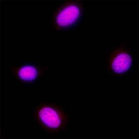 GATA-2 was detected in immersion fixed HUVEC human umbilical vein endothelial cells using Goat Anti-Human/Mouse GATA-2 Antigen Affinity-purified Polyclonal Antibody (Catalog # AF2046) at 5 µg/mL for 3 hours at room temperature. Cells were stained using the NorthernLights™ 557-conjugated Anti-Goat IgG Secondary Antibody (red; NL001) and counterstained with DAPI (blue). Specific staining was localized to cell nuclei. Staining was performed using our protocol for Fluorescent ICC Staining of Non-adherent Cells.Applications for Human/Mouse GATA-2 Antibody