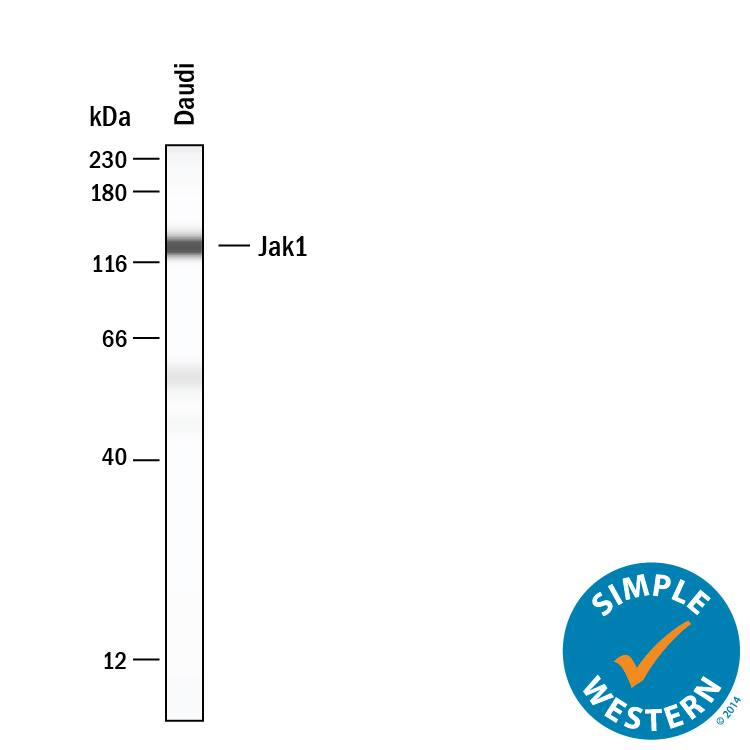 Simple Western lane view shows lysates of Daudi human Burkitt's lymphoma cell line, loaded at 0.2 mg/mL. A specific band was detected for Jak1 at approximately 139 kDa (as indicated) using 10 µg/mL of Mouse Anti-Human/Mouse Jak1 Monoclonal Antibody (Catalog # MAB42601) . This experiment was conducted under reducing conditions and using the 12-230 kDa separation system.Applications for Human/Mouse Jak1 Antibody